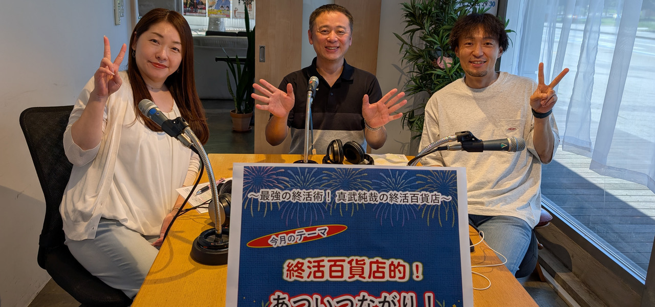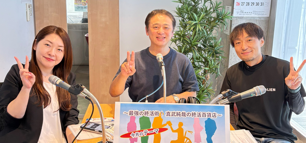 弊所代表の上級終活カウンセラー眞武純哉がメインパーソナリティーを務めるFMラジオ『終活のスペシャリストがお送りする 終活書店~純薫堂~』(AirStationHibiki(88.2MHZ)本社スタジオから毎月第2木曜日13:00~14:00生放送)が令和元年9月よりパワーアップ&リニューアルし、終活パートナー九州代表 眞武純哉の冠番組として『最強の終活術! 真武純哉の終活百貨店』に生まれ変わりました!